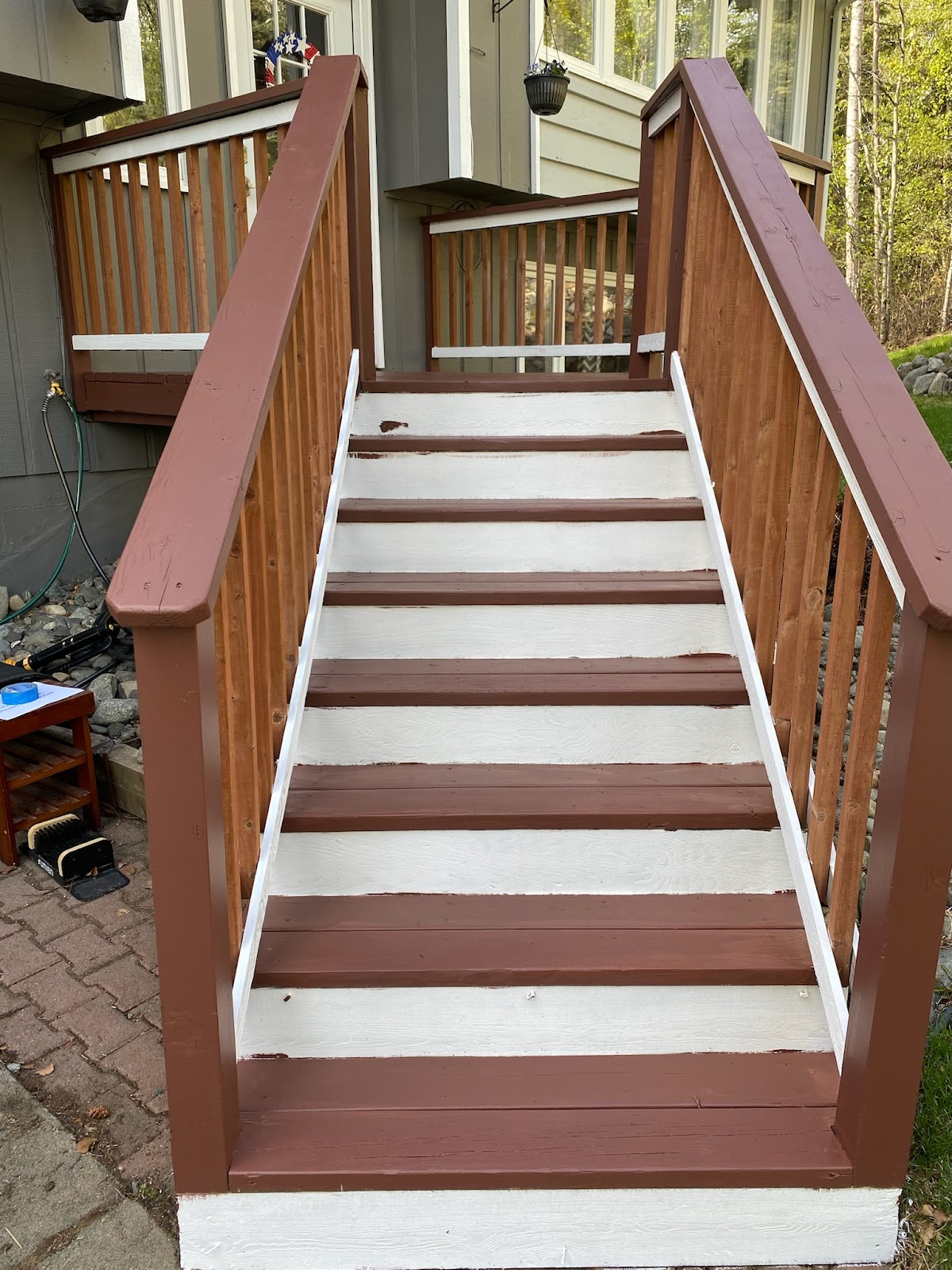 After the long winter our deck took quite the beating being snow shoveled. The old green paint was seeping through. So, I went to the hardware store and went to work.